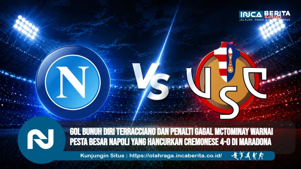 JAKARTA, olahraga.incaberita.co.id – Napoli bantai Cremonese 4-0 dalam laga Matchday 34 Serie A 2025/2026 di Stadio Diego Armando Maradona, Jumat malam 24 April 2026 atau Sabtu 25 April 2026 dini hari WIB. Empat gol tanpa balas lahir dari Scott McTominay menit ke-3, gol bunuh diri Filippo Terracciano menit ke-45, Kevin De Bruyne menit ke-45+3, dan Alisson Santos menit ke-52. Kemenangan telak ini menjadi jawaban sempurna Antonio Conte atas kekalahan memalukan 0-2 dari Lazio sebelumnya.